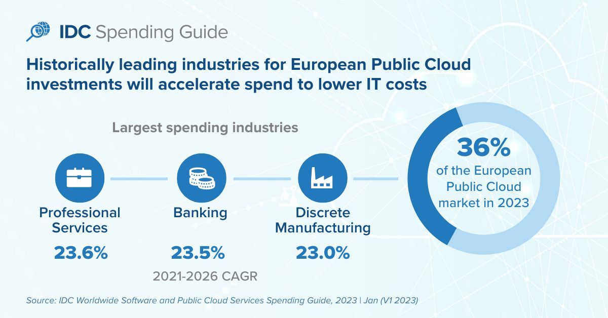 In questo scenario, non stupisce che gli ambiti in cui la spesa per servizi di cloud pubblico è maggiore siano proprio quelli più interessati sia da una gestione massiva di dati, sia da requisiti specifici di compliance e sicurezza. Secondo IDC servizi professionali, banking e manufacturing di prodotto nel 2023 rappresenteranno, insieme, il 36% degli investimenti europei in Public Cloud.