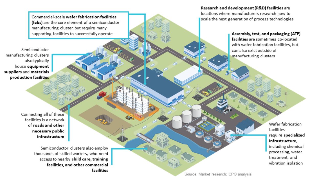 CHIPS for America ha definito già alcuni obiettivi specifici da raggiungere entro questo decennio. Innanzitutto, la realizzazione di almeno due "cluster" per la produzione su larga scala di chip all'avanguardia. Un cluster viene descritto come un'area geograficamente limitata in cui sono presenti più impianti di produzione (fab) posseduti e gestiti da una o più aziende. Il cluster comprende anche i suoi reparti di ricerca e sviluppo, infrastrutture specializzate dedicate, una rete di fornitori "affidabili e impegnati a operare ed a innovare negli Stati Uniti".