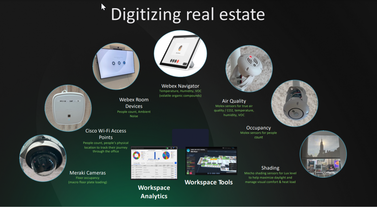 Il tutto favorendo la digitalizzazione del posto di lavoro, attraverso i dati: “Il nostro viaggio intorno ai dati inizia con le nostre telecamere di sicurezza Meraki con cui è possibile registrare le persone che entrano ed escono dall'edificio, comprendendo l'utilizzo complessivo dello spazio; prosegue con gli access point Wi-Fi nelle aree aperte, in grado di contano i dispositivi mobili e fungere da proxy per capire come vengono utilizzati appunto gli spazi aperti. All'interno di ogni spazio di collaborazione, si contano le persone al fine di gestire al meglio l’utilizzo degli spazi; attraverso Cisco Webex si abilitano sensori di temperatura, qualità dell'aria e umidità, tutti integrati. E molto altro ancora. Tutti dati elaborati attraverso Cisco Spaces per fornire informazioni in tempo reale su come vengono utilizzati gli spazi e come si ‘sta comportando’ il posto di lavoro. Non si può infatti gestire ciò che non si può misurare. Elementi di analisi e di misurazione, dati integrabili con quelli di terze parti al fine di poter creare l’ambiente del lavoro presente e futuro”. 5 mila punti dati che vengono acquisiti non solo per l'analisi ma anche per crere appunto nuovi strumenti funzionali ad abilitare il concetto di FoW.