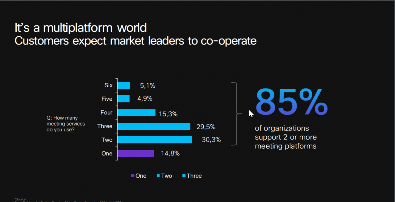 Da segnalare inoltre l’approccio adottato da Cisco in relazione alle piattaforme di collaborazione: “La maggior parte delle aziende (circa l’85% secondo un sondaggio Cisco) fa uso di più di una piattaforma di comunicazione, di meeting virtuali. Per questo come Cisco, pur promuovendo ovviamente la nostra tecnologia Cisco Webex utilizzata per realizzare meeting virtuali ma anche abilitare servizi voce, eventi e dare vita a tutti i sistemi hardware negli uffici, poniamo un’attenzione specifica nello sviluppare soluzioni agnostiche. Significa che tutte le nostre soluzioni per la videocomunicazione e i meeting devono poter interoperare con tutte le piattaforme di meeting virtuali presenti oggi sul mercato. Per esempio, sui nostri dispositivi abbiamo abilitato la capacità non solo di entrare in Webex, ma anche di entrare in un meeting Google piuttosto che Microsoft Bing o FaceTime. Un concetto di ‘meeting agnostico’ che risponde a una forte richiesta dei clienti.