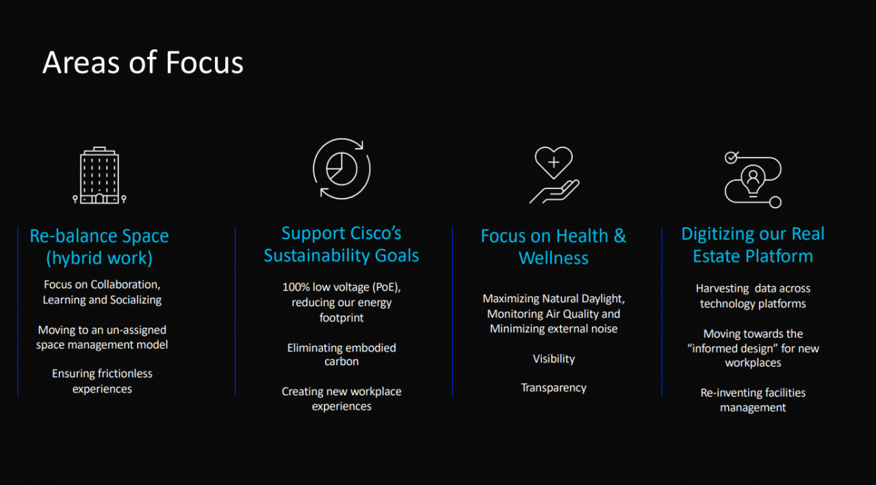 I numeri Cisco legati al tema coinvolgono e riguardano 68 mila dipendenti in 1,67 milioni di metri quadrati, in circa 360 edifici, per un investimento annuale pari a 1 miliardo di dollari; un asset inevitabilemente sotto stress: “In primis, Cisco ha sperimentato direttamente il ritorno in ufficio e molti dei concetti legati al nuovo modo di lavorare, per cui la la pandemia ha rappresentato un enorme catalizzatore del cambiamento nel modo in cui le persone considerano oggi al lavoro. Il lavoro non rappresenta un posto in cui si va, ma bensì l’attività che si svolge, la cui la sfida principale è riuscire a capire come e dove lavorano le persone e come viene svolto il lavoro”. Un posto di lavoro che ha bisogno di riconquistare la fiducia dei dipendenti: ”Le persone devono percepire un certo valore nel tornare in ufficio, che deve essere più attrattivo rispetto al passato, deve calamitarle, creando esperienze che spingono a ritornare negli spazi fisici, senza costringerle a farlo”.