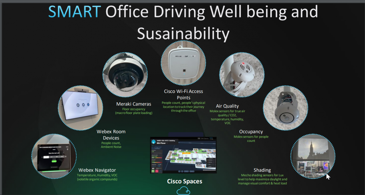 Il tutto senza perdere di vista le sfide relative alla sostenibilità, per un vendor, che ha l'obiettivo aziendale di essere Net Zero entro il 2040 in tutti gli ambiti. Un concetto applicato nell'edificio newyorkese che, costruito nei primi anni '70 oggi è orientato in questa direzione, a partire dalla rete, base per la sostenibilità, con tecnologie PoE (a basso voltaggio) per ridurre il proprio footprint energetico, ed eliminando ‘embodied carbon’, ovvero acciao, rame, … facendo funzionare la potenza oltre la categoria standard 6 cavi di rete: “ È una parte fondamentale del nostro percorso di sostenibilità, che ci ha permesso di risparmiare enormi quantità di energia, ovvero dal 40% al 50% di riduzione del consumo energetico”. Facendo altresì un utilizzo spinto delle tecnologie per creare nuove esperienze di workplace, utilizzando, per esempio, i comandi vocali per abbassare e alzare le tende a seconda delle necessità di illuminazione, controllando le luci tramite il touchpad: “Utilizziamo la tecnologia per contare il numero di persone nella stanza e impostare e bilanciare la temperatura in uno spazio in base all'occupazione, ovviamente nel totale rispetto della privacy dei singoli”.