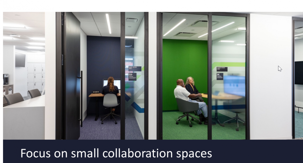 Ci si è inoltre concentrati sull’abilitazione di spazi per la collaborazione video, introducendo dispositivi video ovunque per abilitare l’experience sia che si trattasse di grandi esperienze panoramiche di alto livello che in per tanti piccoli spazi di collaborazione: “Stiamo verificando che la maggior parte delle nostre esperienze di collaborazione coinvolgono in realtà meno di quattro persone. E infatti il 75% degli spazi di collaborazione in questo ufficio è focalizzato sulla collaborazione in piccoli gruppi, meno di sei persone. E il 20% delle nostre tecnologie video è in open space per essere utilizzato dalle persone in modo spontaneo. E mentre progettavamo quegli spazi, ci siamo assicurati che la tecnologia fosse progettata e non aggiunta. Si è pensato prima alla tecnologia e attorno ad essa si sono costruiti gli spazi e le relative room. Una tecnologia ‘designed in’ che tenesse conto di postura, superficie, ambiente e densità”.