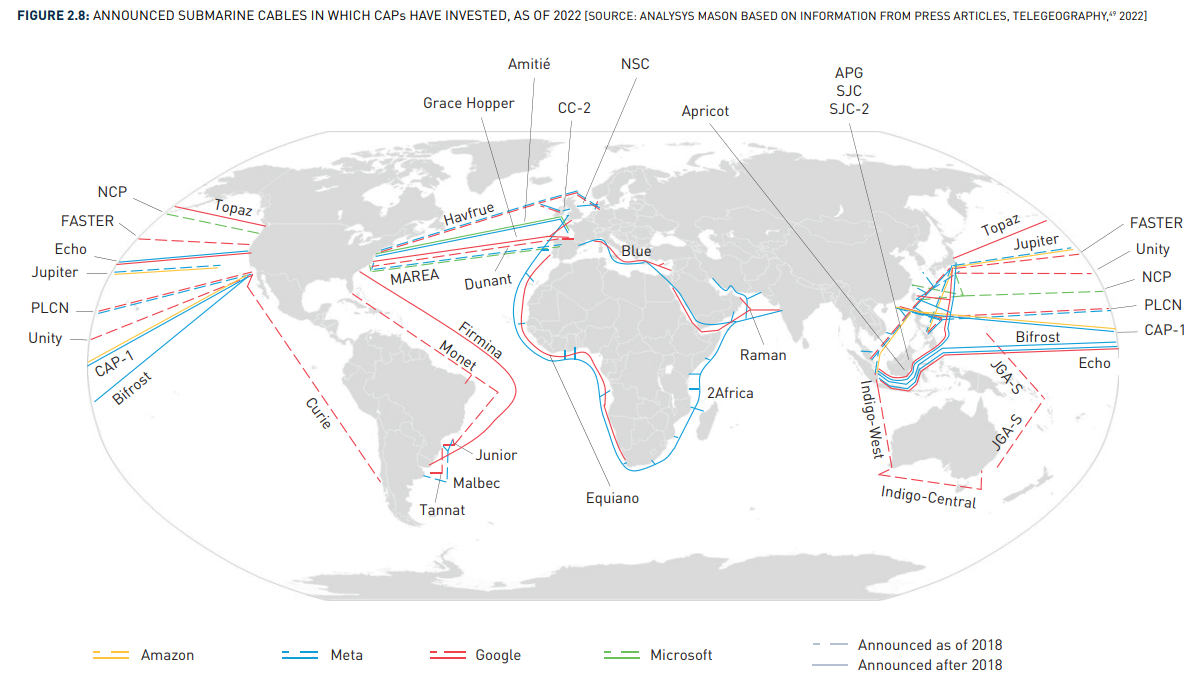 Meta pone l'accento anche sul ruolo dei CAP nello sviluppo delle infrastrutture "complementari" a quelle delle Telco tradizionali, o comunque della maggioranza. I grandi cloud provider investono soprattutto nella posa e nella gestione dei cavi transoceanici e, in misura minore, nella creazione di Content Delivery Network più o meno private che agevolano il traffico dei dati all'interno delle loro infrastrutture.