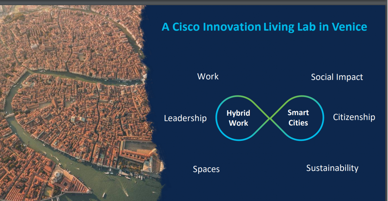 Di particolare interesse il tema declinato da Gianpaolo Barozzi, Cisco Purpose Innovation Lead, nello speech “Venywhere: The Future of Work Living Lab’, un progetto avviato lo scorso anno da Cisco (oggi giunto alla fase 2.0), in partnership con una startup dell'università Ca Foscari, supportata dalla Fondazione di Venezia, con l’obiettivo di ripopolare la città di Venezia con i nomadi digitali.