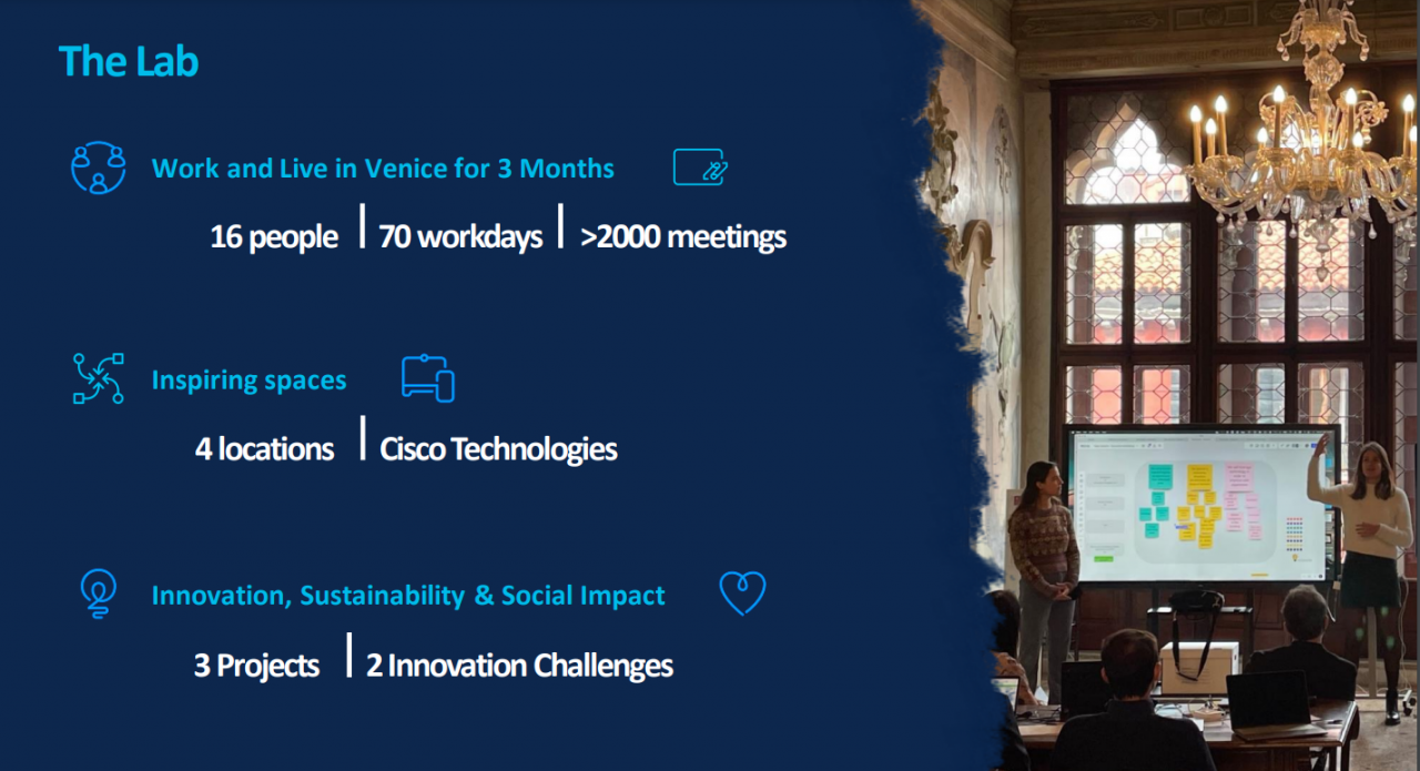 Di fatto, Cisco ha mandato sul posto 16 delle proprie persone a lavorare e vivere tre mesi a Venezia, per comprendere le dinamiche del vivere il lavoro ibrido in modo profondo. Forti di un’esperienza di smart working aziendale, o comunque di lavoro da remoto da parecchi anni (lo stesso Barozzi lavora con un gruppo globalmente distribuito da 14 anni, in cui nessuno opera nello stesso ufficio), "ci siamo chiesti come questo nostro modo di operare potesse essere applicato all'interno degi spazi di una città”, racconta il manager. Quattro gli spazi fondamentali in cui le persone potevano scegliere di lavorare ogni giorno con strumenti Cisco, operando su tre progetti speciali e due Innovation Challenges dedicate alla città per creare uno stretto legame con il territorio.