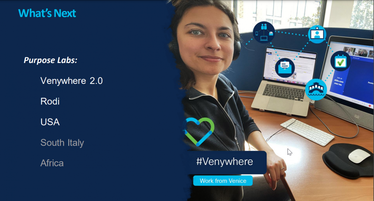 Il progetto Venywhere rappresenta il prototipo, e anche un po’ l'archetipo, degli sviluppi del vendor. Dopo averlo destrutturato per capirne gli elementi fondamentali che lo hanno fatto funzionare ora si stanno mettendo in piedi i Purpose Labs, laboratori all'interno dei quali Cisco punta a sviluppare e rendere il proprio Purpose sia per le proprie persone che per il territorio e le comunità, che, come chiarisce Barozzi: “Significa appunto sviluppare un mondo più inclusivo, in termini di sostenibilità economica, ambientale e sociale tramite la nostra tecnologia”. In concreto, il vendor sta identificando alcuni ambiti, territori e comunità in cui cominciare a costruire e abilitare questo modello.