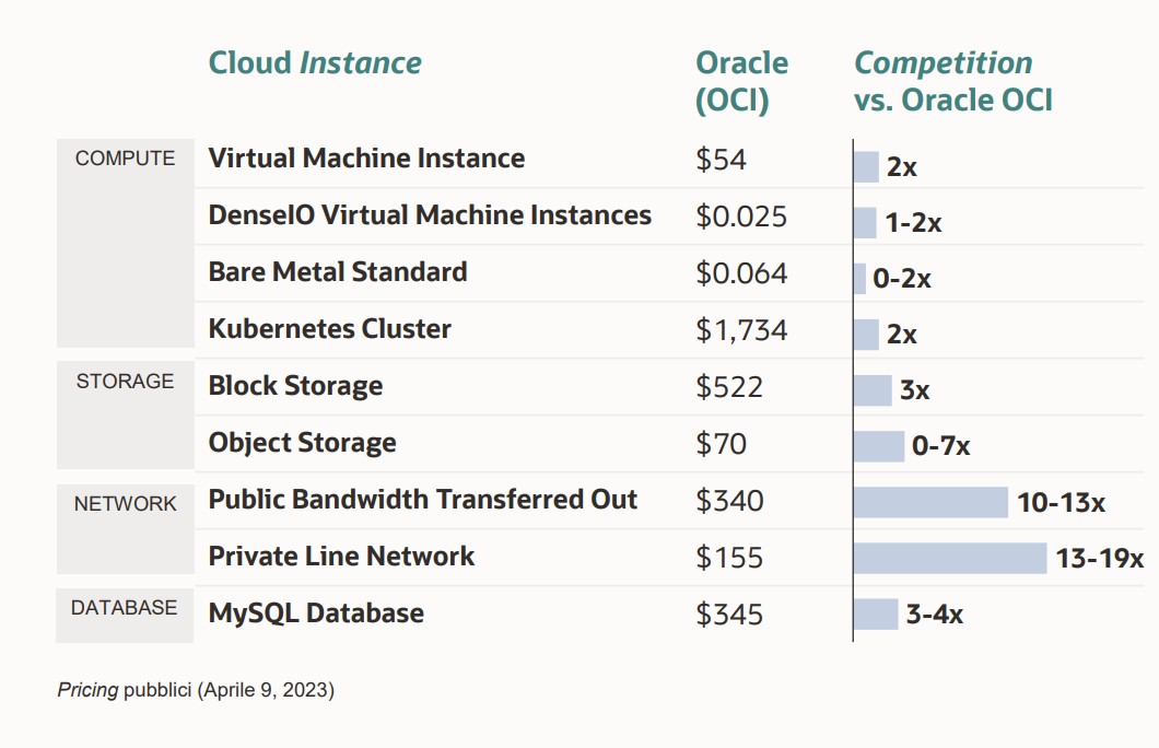 E, in effetti, se non proprio in termini di markeshare, Oracle può a buon diritto qualificarsi tra i big almeno in termini di crescita. I dati del secondo trimestre fiscale 2023 dell’azienda parlavano di un incremento "bulgaro”, una forte crescita complessiva dei ricavi che è stata alimentata dalle attività cloud di Oracle sia in ambito applicativo che infrastrutturale cresciute rispettivamente del +59% e del +45% a valuta costante, quest’ultima (IaaS), leggermente ridimensionato nel terzo trimestre. L’azienda fondata da Larry Ellison raggiunge così il miliardo di gettito dal cloud in un trimestre. Certo, magari non si compete ancora con un AWS che fattura 20,5 miliardi di dollari in un trimestre (+27%) e i seguenti, Microsoft Azure (+35%) e Google Cloud (+38%) ma, comunque, il tasso di crescita di Oracle Cloud in percentuale è quasi il doppio di AWS e decisamente superiore agli altri due big.