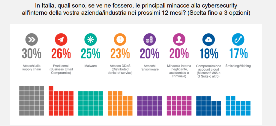 Tra le minacce maggiormente percepite, gli attacchi alla supply chain sono la prima preoccupazione, seguiti dalle frodi via e-mail di tipo BEC, Business Email Compromise, e dal malware. Non è quindi un caso se il 51% dei Ciso italiani afferma di avere controlli adeguati per mitigare il rischio della supply chain, con un leggero aumento rispetto al 49% dello scorso anno. Però, nonostante queste protezioni possano sembrare adeguate al momento, in futuro i Ciso potrebbero sentirsi maggiormente a corto di risorse: il 53% afferma che l’instabilità economica ha avuto un impatto negativo sul loro budget per la cybersecurity.