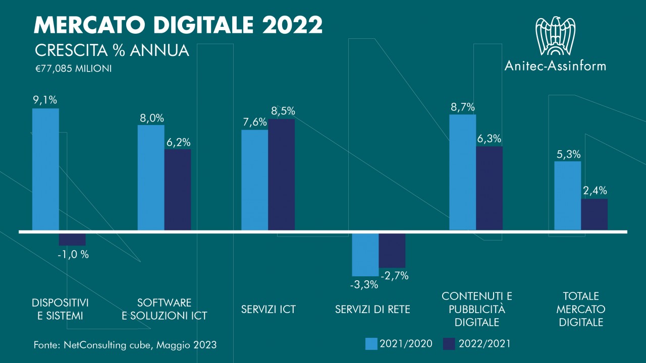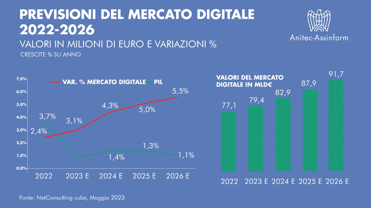 “il 2022 ci consegna un mercato digitale in aumento, che ha raggiunto un valore superiore a 77 miliardi di euro. La trasformazione digitale si conferma una leva economica significativa e il suo ruolo nella ripresa economica del Paese è stato e sarà sostanziale, soprattutto adesso. Dobbiamo spingere su interventi anticiclici, portando avanti le riforme e le politiche pubbliche che consentano all’innovazione di fiorire, in un contesto competitivo, dando spazio ai giovani e ai loro talenti”, commenta Marco Gay, Presidente di Anitec-Assinform.