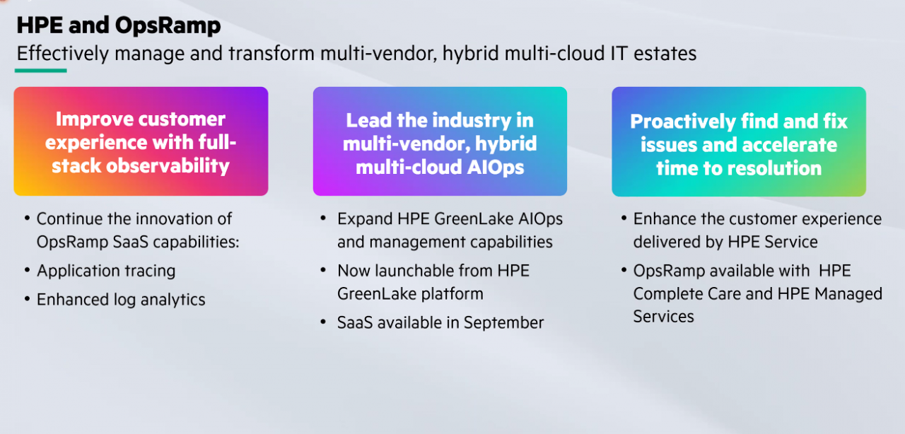Innanzitutto, arriva l’integrazione del software OpsRamp come offerta SaaS, in modo da dare agli utenti GreenLake sia l’osservabilità sia l’automazione di asset e applicazioni in ambienti eterogenei, multi-vendor e multi-cloud. Queste nuove funzionalità, derivanti dall’acquisizione di OpsRamp avvenuta a marzo scorso, offrono ai clienti tool per promuovere l'automazione e la semplicità, e ridurre i costi, in tutti gli ambienti cloud ibridi.