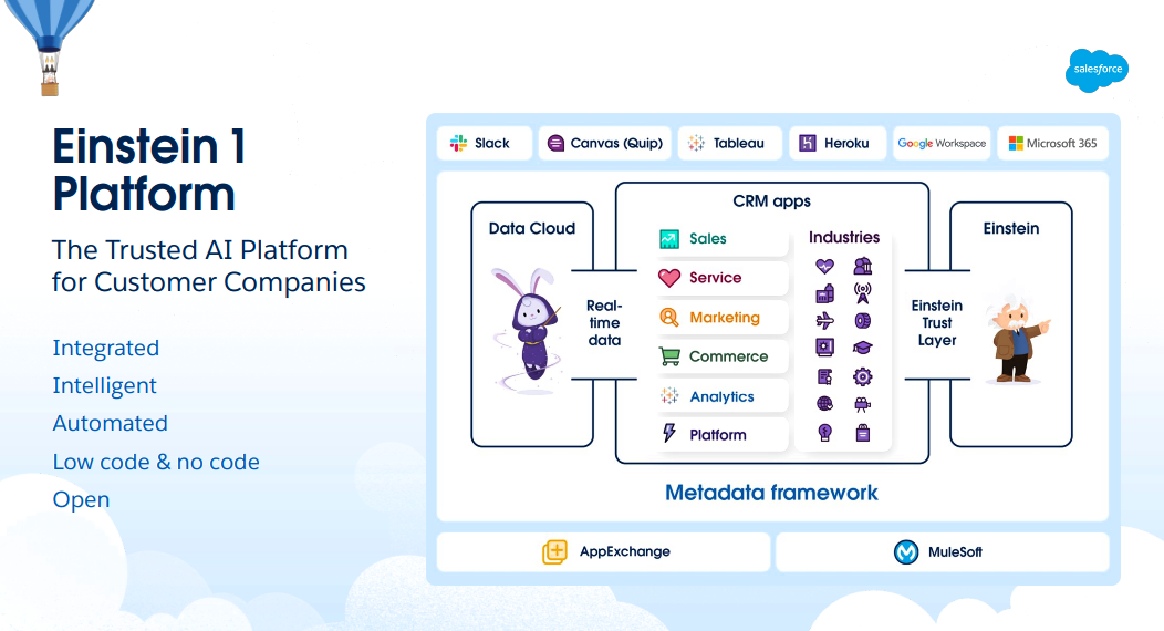 Vi è anche Einstein Copilot Studio, per dare modo alle aziende di creare una generazione completamente nuova di app basate sull'intelligenza artificiale con suggerimenti, competenze e modelli di intelligenza artificiale personalizzati per chiudere le trattative di vendita più rapidamente, semplificare il servizio clienti, creare automaticamente siti Web basati su cronologia di navigazione personalizzata, o trasformare in codice le istruzioni del linguaggio naturale, oltre a centinaia di altre attività aziendali. Einstein Copilot Studio fornisce inoltre la configurabilità per rendere Einstein Copilot disponibile per l'uso su canali rivolti ai consumatori come i siti Web per potenziare la chat in tempo reale o integrarsi con piattaforme di messaggistica come Slack, WhatsApp o SMS.