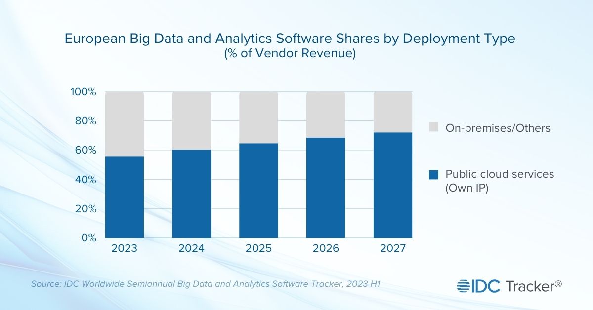 Guardando più avanti, stima IDC, il comparto Big Data analytics dovrebbe avere un tasso di crescita annuale del 19,8% nel periodo 2023-2027. Con una crescente prevalenza delle soluzioni in cloud, prevedibilmente. Per le stime di IDC il 2023 si è chiuso con oltre la metà (55,6%) del mercato già su cloud pubblico. Questa percentuale aumenterà a un tasso del 27,8% l'anno fino al 2027. In confronto, le classiche soluzioni on-premise cresceranno solo del 6,7% l'anno.