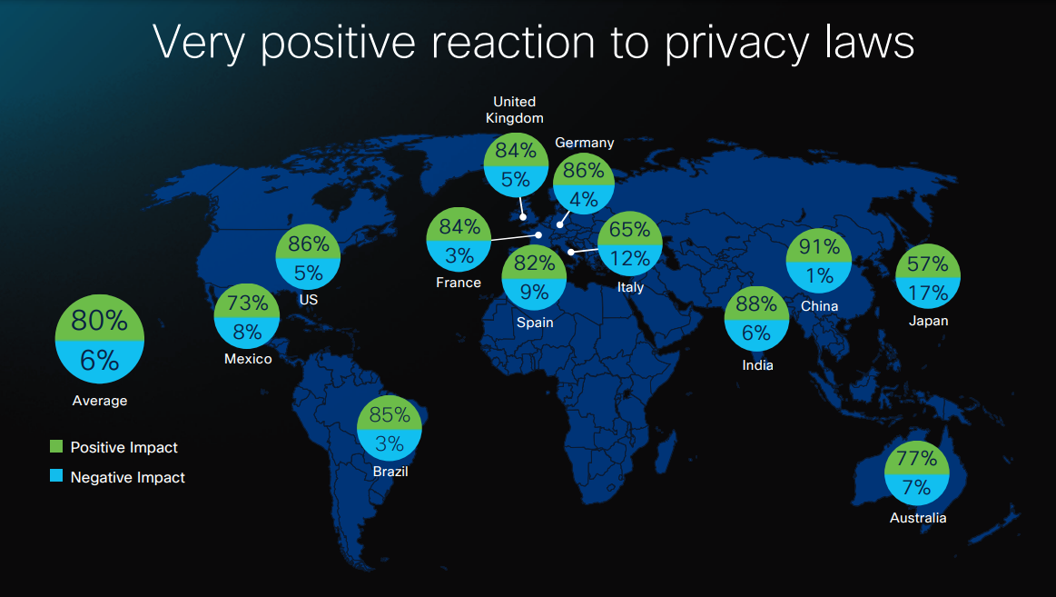 Nonostante i costi e i requisiti associati alle leggi sulla privacy, l'80% degli intervistati a livello globale ritiene che le leggi sulla privacy abbiano avuto un impatto positivo, anche se il rispetto di queste leggi spesso comporta sforzi e costi significativi. Governi e aziende stanno cominciando a impostare i requisiti di localizzazione all’interno del Paese o della regione, questo permette di poter catalogare i dati, di mantenere le registrazioni delle attività di elaborazione, implementare i controlli necessari e rispondere alle richieste degli utenti. Sebbene la maggior parte delle aziende (91% a livello globale, 92% in Italia) ritenga che i propri dati siano più sicuri se conservati all'interno del proprio Paese o della propria regione, il 76% degli intervistati in Italia ha affermato che un fornitore che opera a livello globale è in grado di proteggere i dati in modo più efficace rispetto a un fornitore locale.