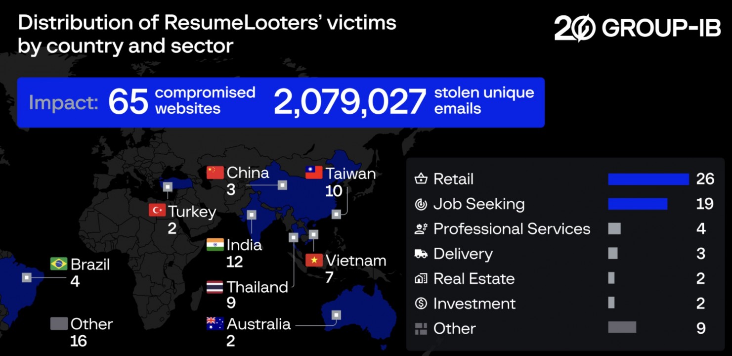 Il nome dice, alla fine, un po' tutto: ResumeLooters ("saccheggiatori di CV") è la denominazione di un gruppo di hacker ostili che - secondo le rilevazioni e le analisi dell’unità di Threat Intelligence di Group-IB - ha colpito almeno 65 siti, principalmente di recruiting e retail, per carpire informazioni personali. La maggior parte delle vittime si trova nella regione Asia-Pacifico, ma alcuni attacchi riusciti sono stati registrati anche in altre zone del mondo. Tra cui anche l'Italia.