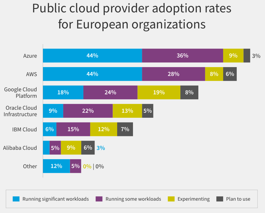La Google Cloud Platform e la Oracle Cloud Infrastructure restano ancora indietro nell'utilizzo attuale delle imprese europee ma il 19% del campione sta sperimentando la GCP e l'8% ha in piano di usarla in futuro, cifre che nel caso della OCI calano al 13% e al 5%. La GCP viene quindi tratteggiata come la piattaforma più "appealing" a breve-medio termine. Sempre che Google rafforzi la sua percezione di business cloud provider, un problema che Oracle ovviamente non ha.