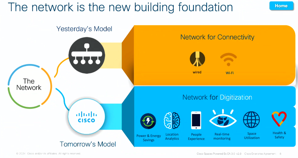 Entrando nel dettaglio della trasformazione in atto, Dalmazzoni spiega che “la rete rimane al centro di tutto: quella stessa rete che era considerata fondamentalmente un elemento per collegare inizialmente i computer e poi i device mobili, diventa oggi centrale per tutto ciò che riguarda l’ottimizzazione energetica, per gli analytics relativi a quello che succede nell'ufficio, per l'esperienza dei dipendenti, per offrire un monitoraggio in real time di ciò che accade per esempio sull'utilizzazione degli spazi, e non ultimo, per il benessere e la sicurezza delle persone”.