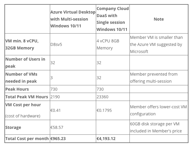 Per chiarire meglio il quadro, il Cispe ha presentato alcuni calcoli relativi alle licenze per SQL Server Enterprise in cloud. Mediamente, attivare un server SQL presso un cloud provider indipendente costa il 17,7% in più. Va ancora peggio per i servizi di Virtual Desktop o Desktop-as-a-Service (DaaS), perché su Azure una singola macchina virtuale può gestire più sessioni utente mentre le lcenze Microsoft impediscono il multi-sessione agli altri provider. Così una ipotetica configurazione per 32 utenti costerebbe su Azure circa 965 euro/mese e per un altro provider quasi 4.200.