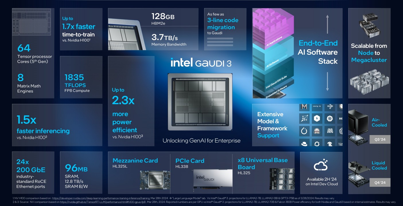 Intel Gaudi 3, disponibile nel corso di questo trimestre per gli OEM, tra cui Dell Technologies, HPE e Lenovo, fornisce un software aperto community based e reti Ethernet standard. Inoltre, consente alle aziende di scalare in modo flessibile da un singolo nodo a cluster, super-cluster e mega-cluster con migliaia di nodi, sostenendo inferenza, messa a punto e formazione su larga scala.