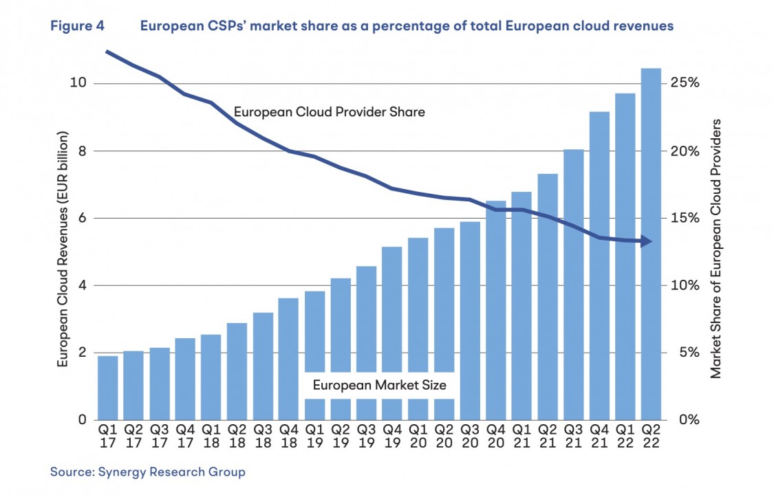 Guardando al mercato europeo del cloud si notano due dinamiche chiare: trimestre dopo trimestre, il volume complessivo del mercato cresce più che linearmente mentre la quota di questo mercato conquistata dai cloud provider europei diminuisce un po' meno che linearmente. Detta in modo più chiaro: la quota del mercato cloud dei provider europei cresce sì, ma poco e comunque molto meno del mercato complessivo. Così la fetta maggiore dello sviluppo del settore resta in mano ai grandi hyperscaler statunitensi.