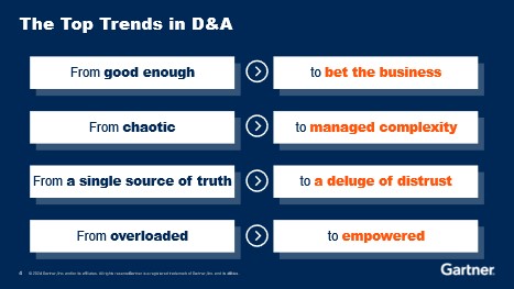 Un altro tema chiave è quello della fiducia, nei dati che alimentano la nuova AI come nei risultati che questa produce. Per entrambi gli aspetti non siamo messi troppo bene, secondo Gartner. Il modello della "single source of truth" non convince più abbastanza le aziende, che oggi sono preoccupate della qualità dei loro dati e la metteranno sempre in dubbio, anche perché devono affrontare sempre delicate questioni di compliance e privacy.