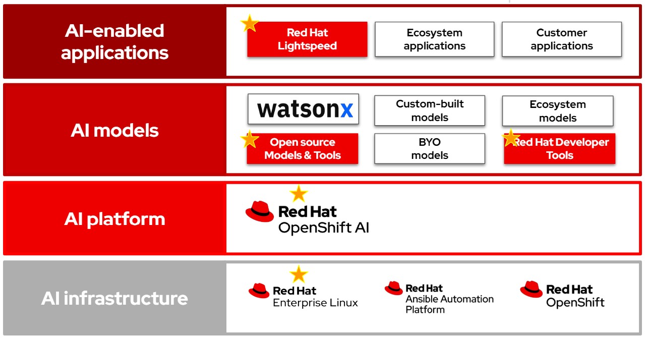 Il suffisso AI si aggiunge alle diverse declinazioni dell’offerta Red Hat, in primo luogo in Red Hat Enterprise Linux AI (RHEL AI per gli amici). La definizione di Badani recita: “la piattaforma per sviluppare, testare ed eseguire i migliori modelli open source di IA generativa Granite a supporto delle applicazioni aziendali”. Dunque, uno strumento per lo sviluppo che sfrutta un modello di AI generativa a partire dall’LLM di IBM, Granite appunto, “ispirato” a Llama di Meta.