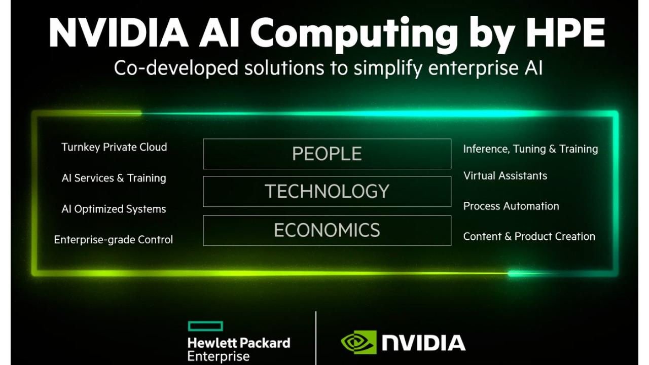 Di rimando, Jensen Huang ha ribadito che “l’AI generativa e l'accelerazione del computing stanno alimentando una trasformazione fondamentale, che vede tutti i settori industriali correre per unirsi a questa rivoluzione industriale: mai prima d'ora Nvidia e HPE hanno integrato così profondamente le proprie tecnologie, combinando l'intero stack di Nvidia AI computing con la tecnologia di cloud privato di HPE, per fornire ai clienti enterprise e ai professionisti dell'AI l'infrastruttura di computing e i servizi più avanzati per espandere la frontiera dell'AI".