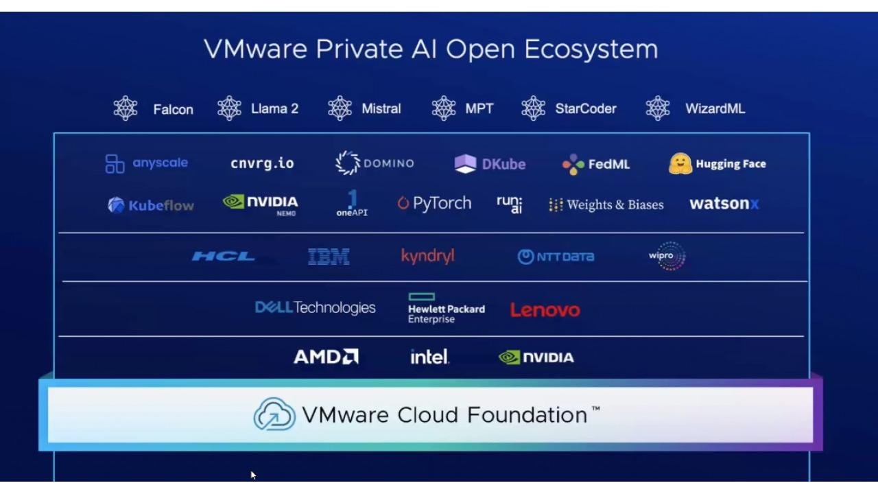 La versione 9 di VCF strizza anche l’occhio all’AI generativa, con la possibilità di adozione accelerata di VMware Private AI Foundation con Nvidia: destinata alle aziende che desiderano sfruttare la potenza dell'AI mantenendo i vantaggi di un cloud privato, VMware Private AI Foundation con Nvidia offre una soluzione completa per l'implementazione, la gestione e lo scaling di applicazioni basate sull'AI in modo sicuro ed efficiente su cloud privati basati su VCF.