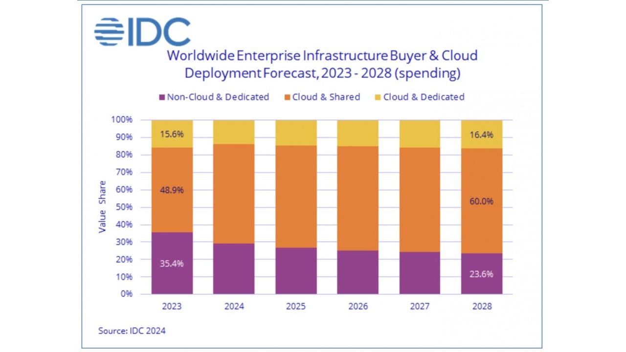 Più a lungo termine, le cifre IDC indicano che la spesa infrastrutturale per il cloud avrà un tasso di crescita del 18,1% l'anno tra il 2023 e il 2028. A quel punto il cloud raccoglierà 253 miliardi di dollari di investimenti e rappresenterà più di tre quarti (il 76,4%) della spesa generale in computing e storage. Il cloud pubblico continuerà a fare la parte del leone in questa dinamica, con quasi 199 miliardi di dollari raccolti nel 2028.