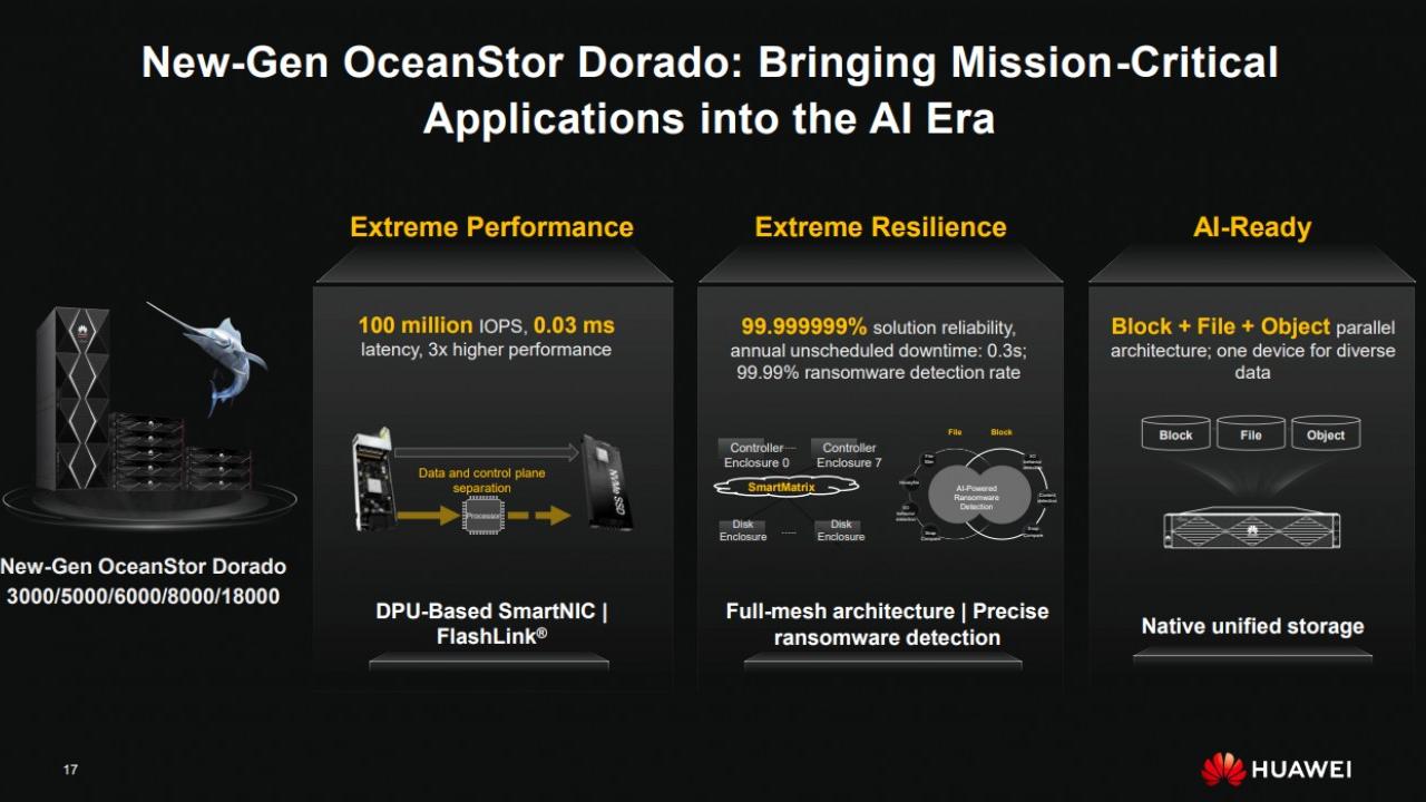 Entrando nel dettaglio della nuova linea OceanStor Dorado, che è all-flash, ovvero abbandona i supporti meccanici, spicca in primis l'utilizzo di una SmartNIC basata su data-processing-unit (DPU), che separa i flussi dati da quelli di controllo, risolvendo i colli di bottiglia delle prestazioni del processore. Moduli hardware dedicati scaricano le risorse di calcolo della CPU, consentendo funzionalità avanzate sulle prestazioni. Inoltre, la collaborazione approfondita tra hardware e software offre prestazioni superiori. L’algoritmo intelligente FlashLink aggiorna la collaborazione tra controller-disco e DPU, raggiungendo oltre 100 milioni di IOPS con una latenza estremamente bassa di 0,03 ms, triplicando le prestazioni rispetto alla generazione precedente.