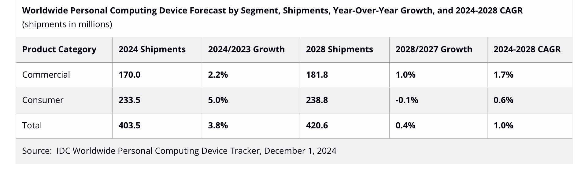 PC e tablet insieme rappresentano il mercato dei personal computing device, che nelle stime dovrebbe chiudere l'anno a quota 403,5 milioni di unità commercializzate, cifra che rappresenta una crescita anno su anno del 3,8%. L'importanza degli acquisti business è dimostrata dal fatto che la percentuale di crescita sale al 5,1%, se consideriamo il solo segmento "commercial".