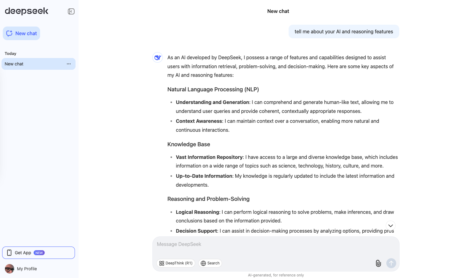 DeepSeek-AI ha fatto notizia lanciando un chatbot molto simile, nel concetto di base e nel funzionamento, a ChatGPT. Si basa su un modello di "ragionamento simulato" battezzato DeepSeek-R1 e considerato analogo a OpenAI-o1, una delle offerte di punta della software house americana. DeepSeek-R1, spiega DeepSeek-AI, "raggiunge performance comparabili a OpenAI-o1 per task matematici, di programmazione e di ragionamento".
