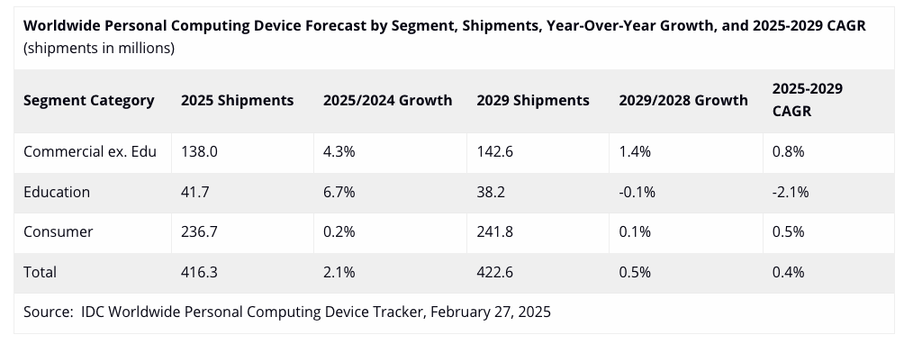 Se i consumatori non sono molto propensi a comprare PC, il mercato deve puntare sugli utenti business. I segmenti aziendale ed Education del mercato saranno infatti quelli che daranno la spinta maggiore nel prossimo futuro. Specialmente nel 2025, dato che quest’anno dovrebbe finalmente farsi sentire il processo di aggiornamento del parco PC per il “pensionamento” di Windows 10.
