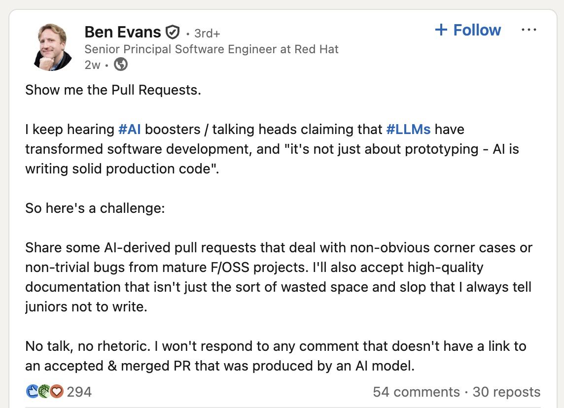 A rilanciare il dibattito è stato, tra gli altri, anche Ben Evans, che proprio sprovveduto in materia non è, essendo Senior Principal Software Engineer di Red Hat. La sua challenge - "Condividete alcune pull request derivate dall'AI che trattino casi specifici non ovvi o bug non banali in progetti F/OSS maturi. Accetterò anche documentazione di alta qualità, che non sia solo il tipo di spazio sprecato e di sbobba che dico sempre agli junior di non scrivere" - ha avuto in risposta pochissimo di valido e moltissimo in commenti ironici sulla GenAI. È uno dei rari casi in cui vale ancora la pena leggere un post di LinkedIn con relativi commenti (è tutto qui).