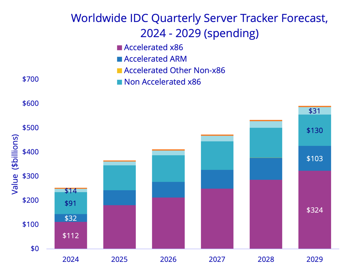 L'importanza dell'AI impatta anche sullo sviluppo tecnologico del settore server. L'architettura tradizionale x86 resta predominante e dovrebbe cubare, per tutto il 2025, qualcosa come 284 miliardi di dollari. Le architetture alternative non-x86 "pesano" meno (la proiezione è di 82 miliardi di dollari nel 2025) ma crescono più velocemente: +64% anno su anno contro +40%. Una delle conseguenze di questa dinamica è che i server con processori ARM stanno man mano prendendo piede nei data center. Un server su cinque tra quelli venduti nel 2025 dovrebbe essere ARM-based. Altro segmento in evidente forte crescita è quello dei server con GPU integrata, che faranno la metà del mercato 2025 in valore.