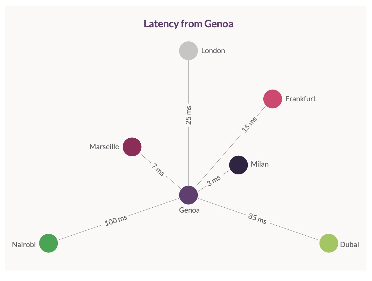 Il fatto che Genova sia relativamente vicina a centri come Milano e Marsiglia evidenzia la forza del capoluogo ligure nel fungere da punto di scambio a bassa latenza all'interno della dorsale europea. I suoi collegamenti verso mercati più lontani come Dubai e Nairobi dimostrano poi la portata offerta dai moderni cavi sottomarini, garantendo prestazioni costanti anche su distanze maggiori.