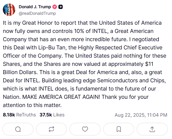 L'annuncio dell'accordo con Intel da parte di Trump, su Truth Social