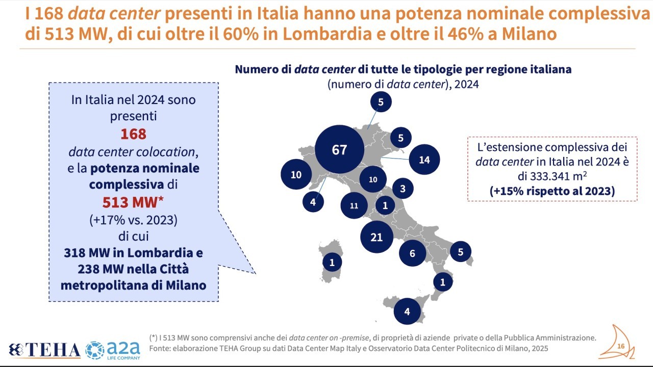 Nel 2024 in Italia la potenza nominale complessiva dei data center è cresciuta del 17%, raggiungendo i 513 MW, di cui il 62% in Lombardia, e appunto il 46% nella zona di Milano, ma stanno mostrando significativi sviluppi anche altre zone, come Lazio (21 data center), Veneto (14), Toscana (11), Piemonte (10) ed Emilia-Romagna (10).