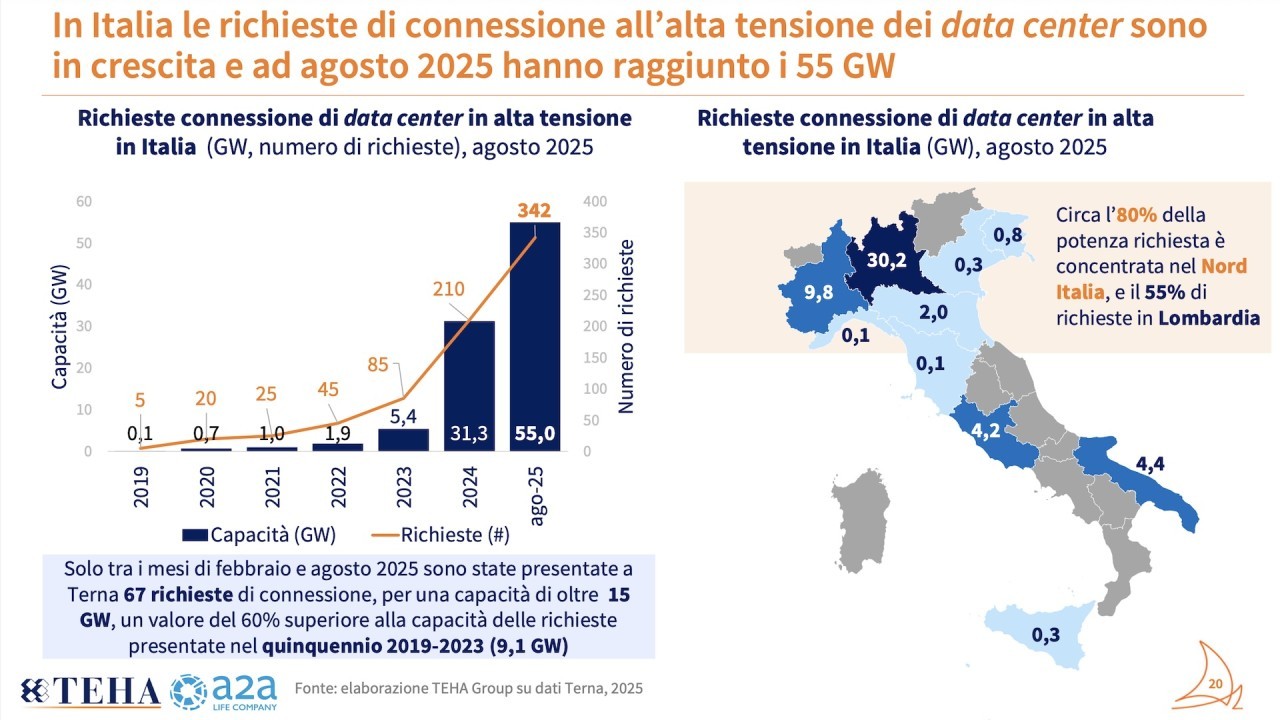 Per dare un’idea, negli ultimi 7 mesi (febbraio-agosto 2025) in Italia sono state presentate a Terna 67 richieste di connessione alla rete in alta tensione da parte di data center, per una capacità di oltre 15 GW. Si tratta di un valore del 60% superiore a tutte le richieste dei cinque anni tra il 2019 e il 2023. Circa l’80% di queste 67 richieste proviene dal Nord Italia, e il 55% dalla sola Lombardia.