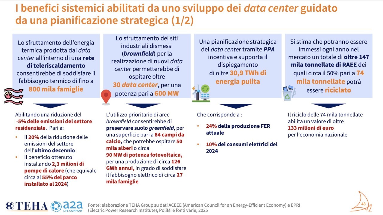 Secondo le stime di TEHA, l’adozione integrata di queste quattro leve in uno scenario di sviluppo “full potential” del settore data center consentirebbe di evitare 5,7 milioni di tonnellate di CO₂ di emissioni annue, equivalenti a quelle generate da 1,7 milioni di cittadini, e un beneficio economico totale di circa 1,7 miliardi di euro.