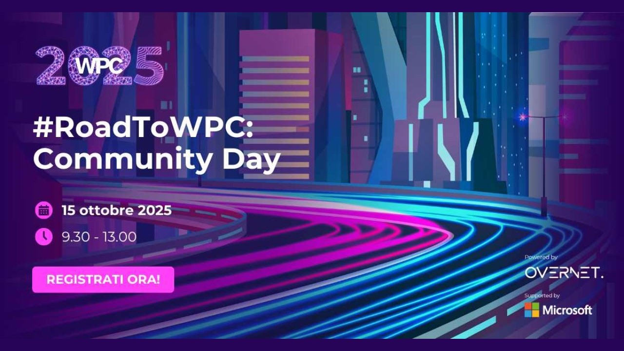 Dal modern work all’AI generativa, dal controllo dei costi nel cloud alla sicurezza Zero Trust e a molto altro: basta collegarsi on line – gratuitamente – a “#RoadToWPC – Community Day”, il prossimo 15 ottobre dalle 9 30 alle 13, per conoscere in anteprima tutti i temi al centro di WPC2025, la più importante conferenza italiana sulle tecnologie Microsoft in programma dal 2 al 4 dicembre ad Assago alle porte di Milano, che celebra quest’anno l’edizione numero 30!