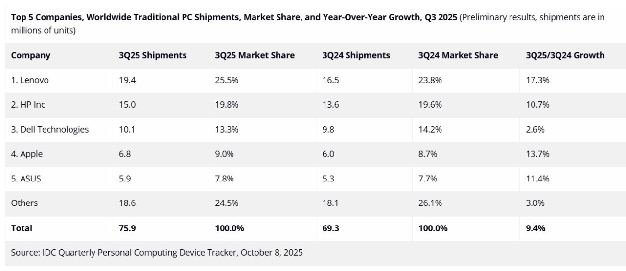 Sarà il "fine vita" di Windows 10, sarà la necessità di sostituire un parco macchine che spesso è più obsoleto del dovuto, dato che l'ultimo grande refresh tecnologico in campo PC risale all'era Covid. In ogni caso, il mercato mondiale dei PC sta in questi mesi registrando una fase di interessante crescita. Secondo le cifre di IDC, infatti, nel terzo trimestre del 2025 le consegne di Personal Computer sono aumentate in volume del 9,4% rispetto all'anno precedente, raggiungendo i 75,8 milioni di unità.