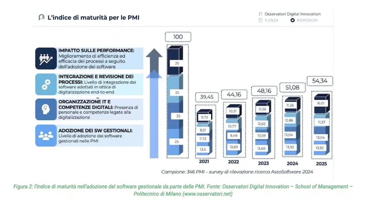 Il settore software italiano ha un impatto rilevante anche sulla digitalizzazione delle PMI. L’indice di maturità elaborato dall’Osservatorio – che misura l’adozione ed efficacia dei software gestionali – ha raggiunto quota 54,34 nel 2025, con un incremento di circa 3 punti rispetto al 2024. Le medie imprese (50-249 dipendenti) trainano la crescita, mentre le piccole (10-49) mostrano un ritardo strutturale.