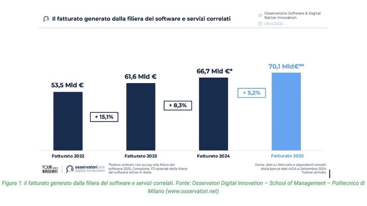 Nel 2024 il fatturato complessivo della filiera italiana del software ha raggiunto i 66,7 miliardi di euro, crescendo dell’8,3%, e dovrebbe raggiungere i 70,1 miliardi in questo 2025, con un ulteriore incremento del 5,2%.