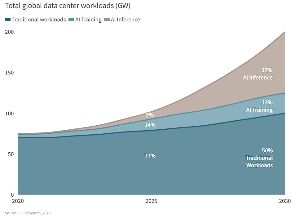 Dal punto di vista tecnologico, la crescita dell'AI è ovviamente la dinamica principale da seguire nel mondo data center. L'AI nel 2025 rappresentava solo il 23% di tutti i workload, con il training degli algoritmi prevalente rispetto all'inferenza (14% contro 9%). JLL stima che entro il 2030 i workload di AI saranno la metà dei carichi di lavoro complessivi, con un "sorpasso" - previsto per il 2027 - dell'inferenza rispetto al training (37% contro 13%).