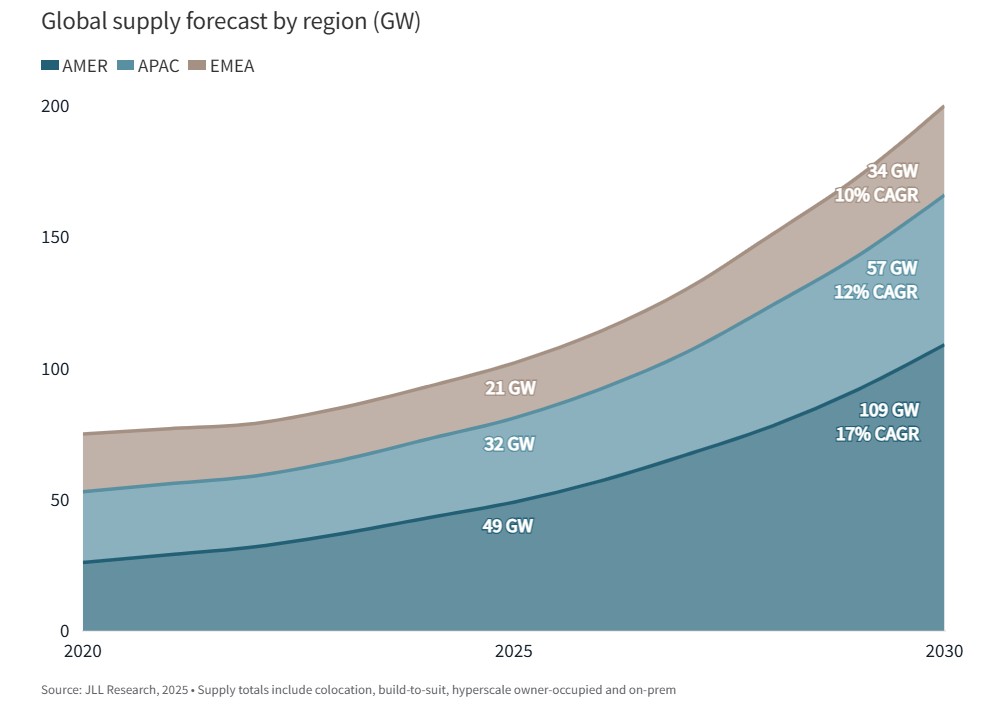 Dal suo particolare punto di vista di azienda globale del real estate, JLL ha condotto una propria analisi sul comparto data center e sulla sua probabile evoluzione nel corso dei prossimi anni, cercando di guardare alle principali dinamiche che ne spingeranno il business. La considerazione chiave è che da qui al 2030 la capacità globale installata raddoppierà, passando dai 102 Gigawatt del 2025 a 200. La differenza è tutta nei nuovi data center che saranno realizzati nei prossimi anni. Questa crescita - di circa il 14% l'anno - sarà trainata dall'espansione del cloud hyperscale e dalla domanda di infrastrutture a supporto dell'Intelligenza Artificiale.