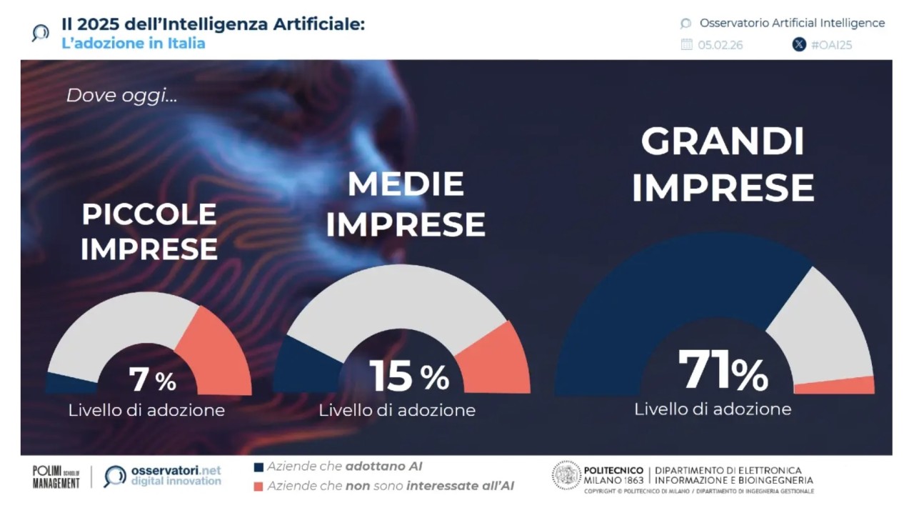 L'AI in generale piace alle aziende italiane. Nel 2025 il 71% delle grandi imprese italiane ha avviato almeno un progetto di AI (nel 2024 era il 59%) e i risultati sono giudicati positivi: il 58% di queste aziende "attive" in campo AI rileva un impatto significativo sul modello di business, anche se un’azienda su tre non riesce a stimare preventivamente il rapporto costi-benefici dei suoi progetti AI.