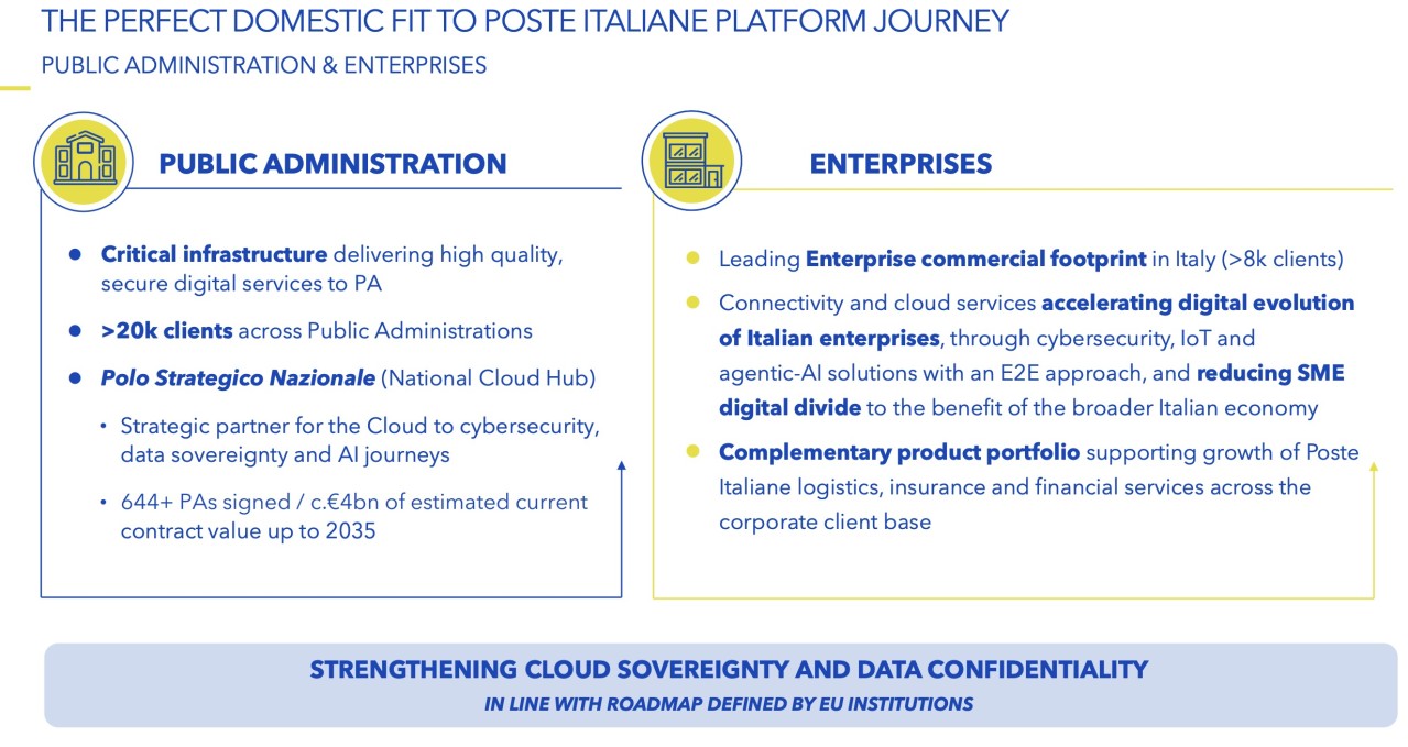 Si tratta in sintesi, per come li descrive Poste, di "una rete fissa e mobile di scala nazionale, una posizione preminente nelle infrastrutture cloud e data center del Paese, e la capacità di offrire connettività sicura e sovrana a imprese, pubbliche amministrazioni e infrastrutture critiche. E proprio sul tasto della sovranità digitale Poste Italiane preme con decisione: la "nuova" Poste-TIM sarebbe in mani sicure, essendo partecipata al 27,2% da CdP e all 22,8% dal Ministero delle Finanze.