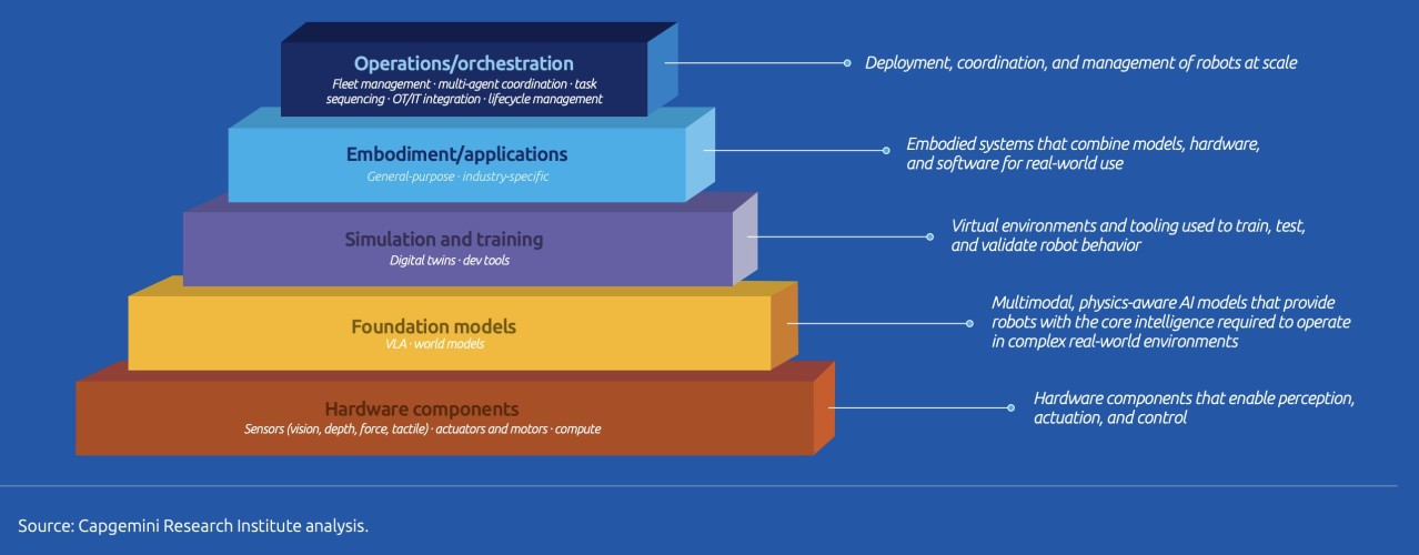 La prima conclusione che Capgemini trae dalla sua analisi è che la Physical AI è a un punto critico della sua affermazione. Lo sviluppo di "foundation model" multimodali permette finalmente di realizzare soluzioni in cui i robot sono in grado di adattarsi a situazioni sconosciute senza necessità di riprogrammazione specifica per ogni attività, estendendone l’impiego in ambienti non strutturati: contesti dinamici che i sistemi robotici precedenti non erano in grado di gestire. Parallelamente, i progressi nella simulazione stanno riducendo i cicli di addestramento dei robot, il cui training avviene ora in ambienti virtuali e non più solo in situazioni reali.