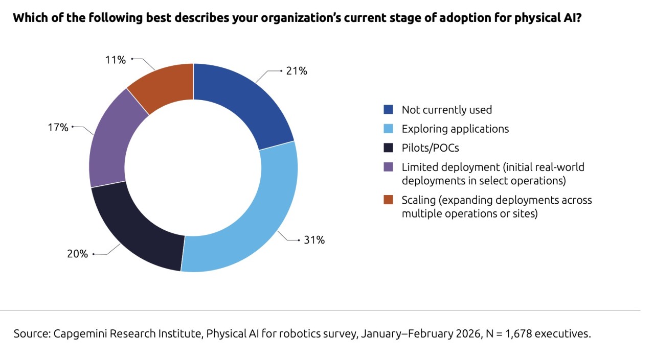 Per capire meglio come stanno le cose in campo AI "fisica", Capgemini ha realizzato il report Physical AI: Taking human-robot collaboration to the next level. Il report si basa su una survey che ha coinvolto un campione di 1.678 dirigenti (il 7% italiani) appartenenti a 15 settori, integrata da interviste approfondite con esperti dell’ecosistema della Physical AI e della robotica.